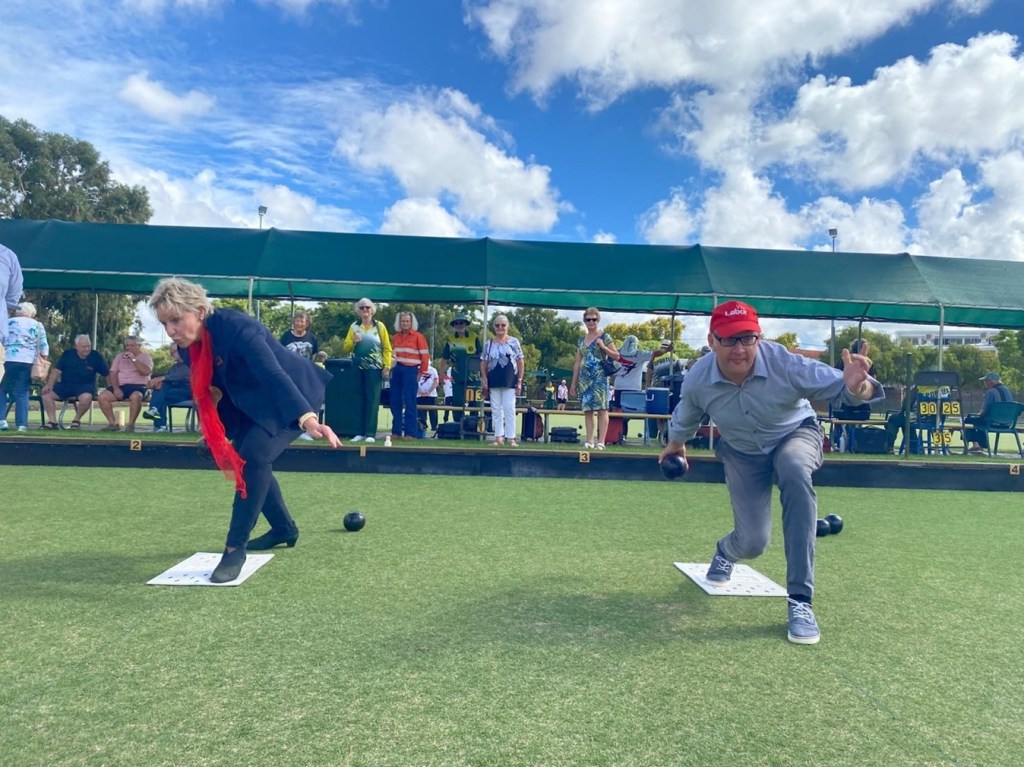 Simon Millman and Alanah MacTiernan playing bowls at Inglewood Bowling Club. Photo: supplied.